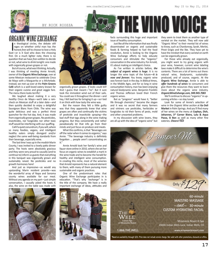 Coachella Valley Weekly https://organicwineexchange.com/coachella-valley-weekly/ Mon, 19 May 2014 20:37:56 +0000 http://drinkorganic.wpengine.com/?p=8894 In theological circles, the debate still rages on whether sinful man has the honest free will to choose to love a Holy God—or is it God who does the choosing first. On a much lighter note, there is no question that we have free-volition to decide or not, what wine to drink tonight: one made with organically grown grapes or not.